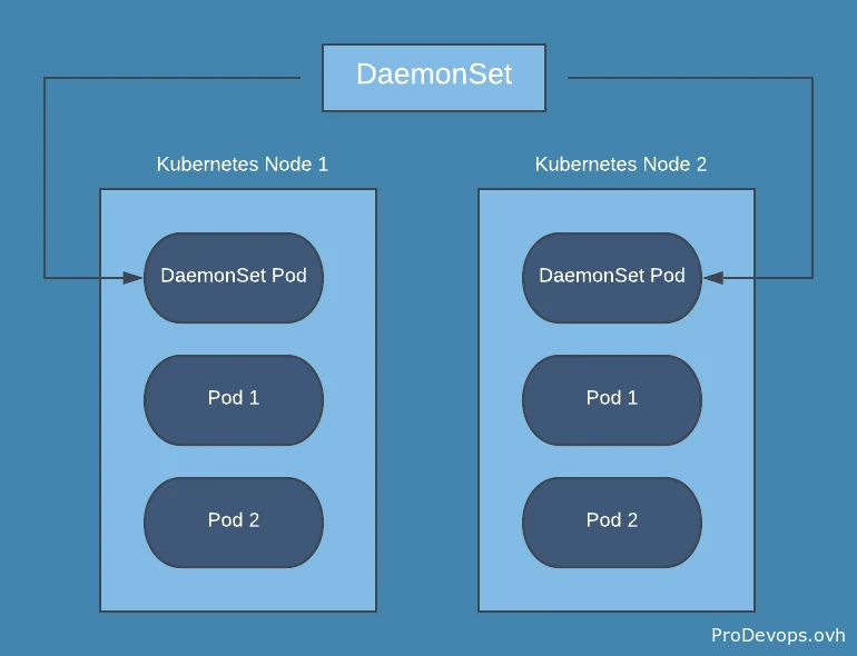 Это контроллер, который гарантирует, что на каждом узле кластера Kubernetes запущен экземпляр заданного пода. Когда добавляется новый узел, на нем автоматически запускается под, управляемый DaemonSet, и если узел удаляется, поды удаляются автоматически. Это идеально подходит для запуска служб мониторинга, сбора логов или других утилит, которые должны быть запущены на каждом узле.