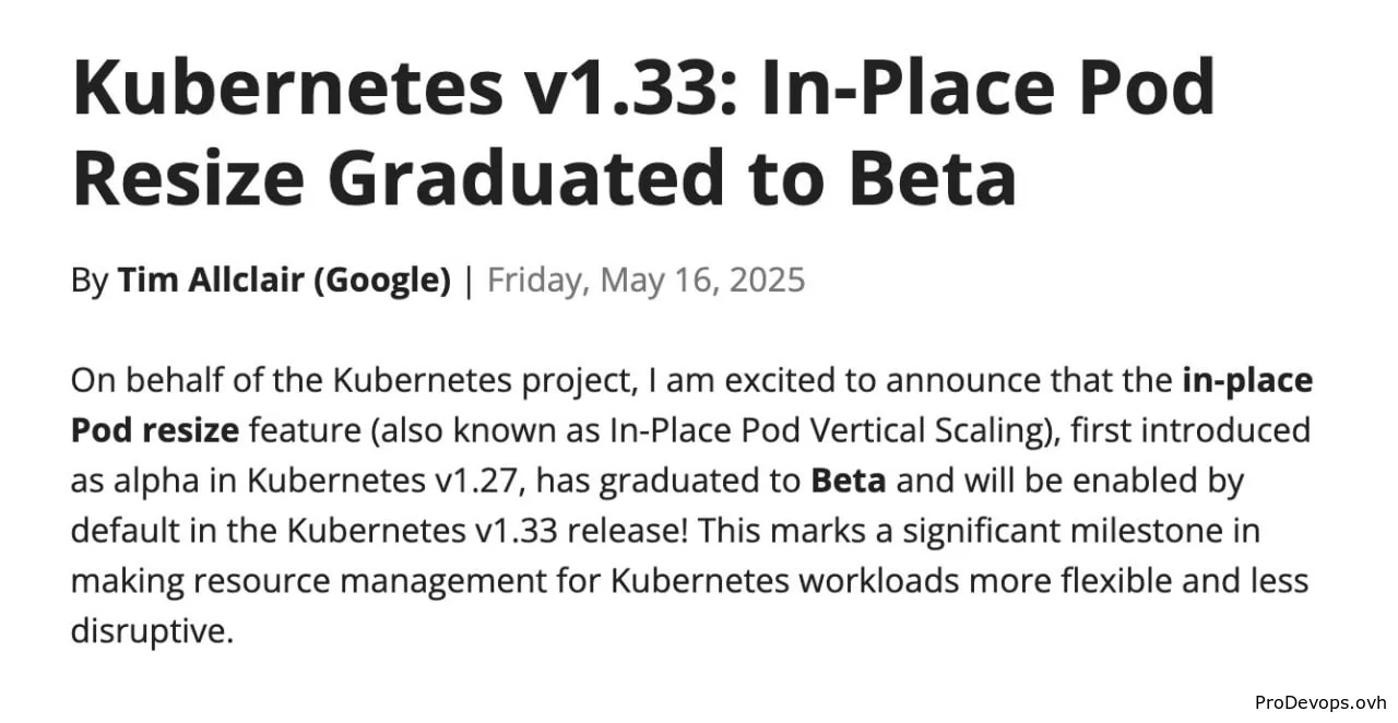 Новая фича «in-place Pod resize» позволяет менять объём памяти и CPU у Pod, пока он продолжает работать. Начиная с версии 1.33 она считается достаточно зрелой для обычного использования и включена по умолчанию. До этого нужно было включать фича-гейт InPlacePodVerticalScaling.