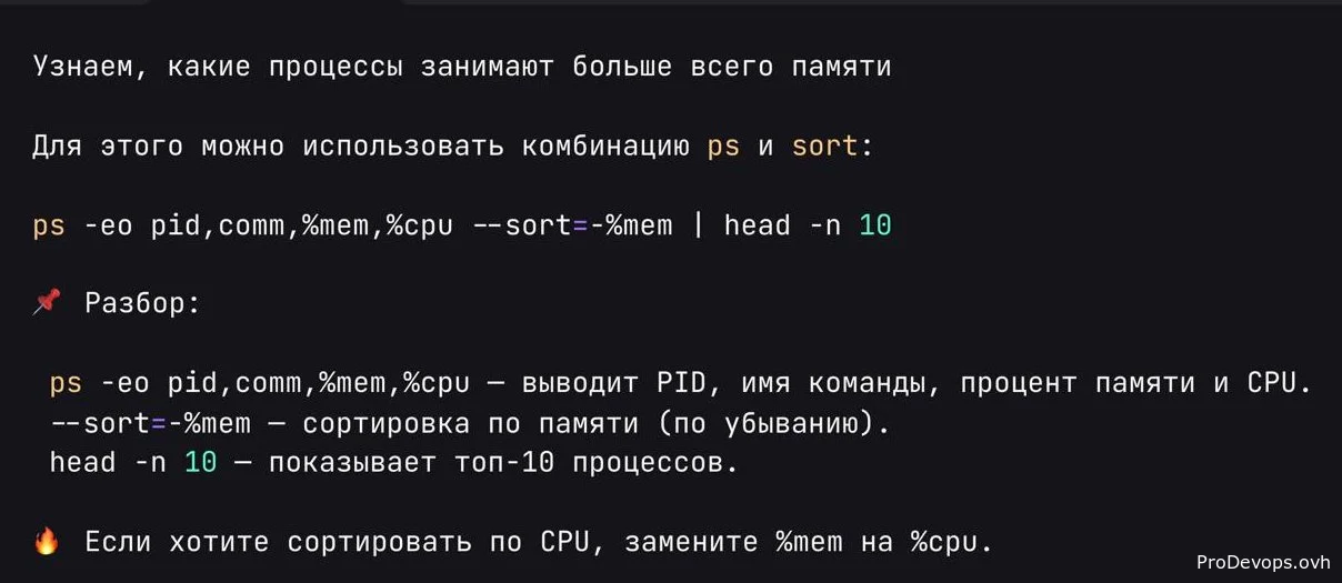 --sort=-%mem — сортировка по памяти (по убыванию).
